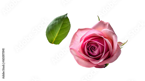 A delicate pink rose with a single green leaf, isolated on a transparent background, showcasing the natural beauty and elegance of a blooming flower