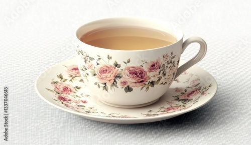 A delicate teacup and saucer, filled with a light-colored beverage, adorned with a floral pattern of pink roses