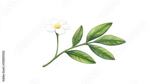 A delicate white flower with green leaves on a minimalistic background, showcasing nature's beauty