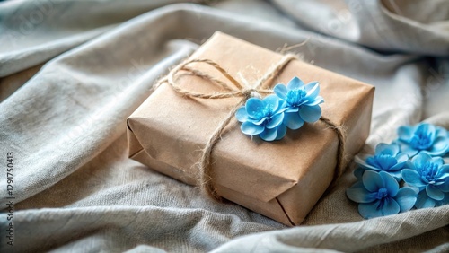 A delicately wrapped gift, adorned with light blue blossoms, rests on a soft, textured fabric