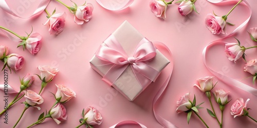 A delicately wrapped present, adorned with a lovely pink ribbon, rests amidst a charming arrangement of pink roses, creating a scene of elegant simplicity and refined beauty.
