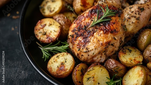 A delicious and appetizing dish featuring roasted chicken with crispy potatoes, garnished with rosemary, presented in a black pan with a dark background.