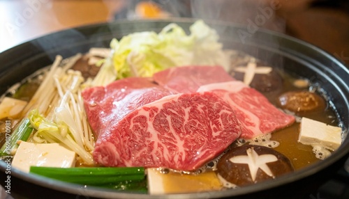 A delicious and steaming sukiyaki hot pot, a traditional Japanese dish featuring thinly sliced marbled beef, fresh vegetables, and tofu
