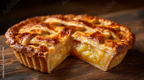 A delicious apple pie with a golden crust, cut open to reveal the filling