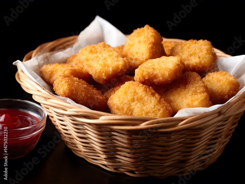A delicious basket of golden-brown chicken nuggets served with tangy ketchup for a delightful snack.
