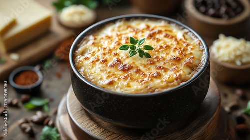 A delicious bowl of baked cheese pasta topped with herbs, surrounded by various ingredients. Perfect for showcasing comfort food and culinary delights in stock photo collections.