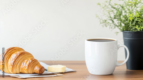 croissant, hot drink, mug, butter, breakfast, morning, food, drink, table, wood, plant, green, bakery, pastry, delicious, calm, peaceful, minimal, simple, white, black, brown, yellow, light, day