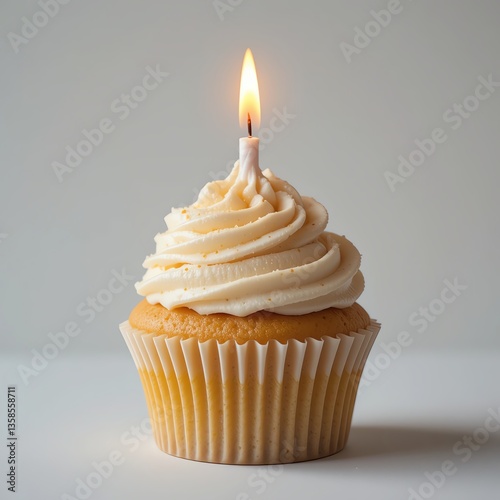 A delicious cupcake topped with creamy frosting and a lit candle, perfect for celebrations and special occasions.