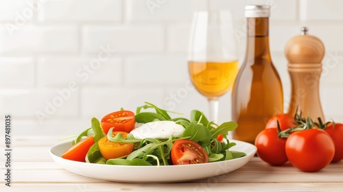 A delicious fresh salad with arugula, cherry tomatoes, and cheese is served with a glass of white wine, highlighting a healthy meal concept in a bright, modern kitchen setting.