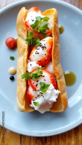A delicious freshly made lobster roll with lobster, lemon, celery, and mayonnaise.