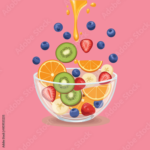 A delicious fruit salad with blueberries, kiwi, orange, strawberries, and banana is drizzled with honey on a pink background.