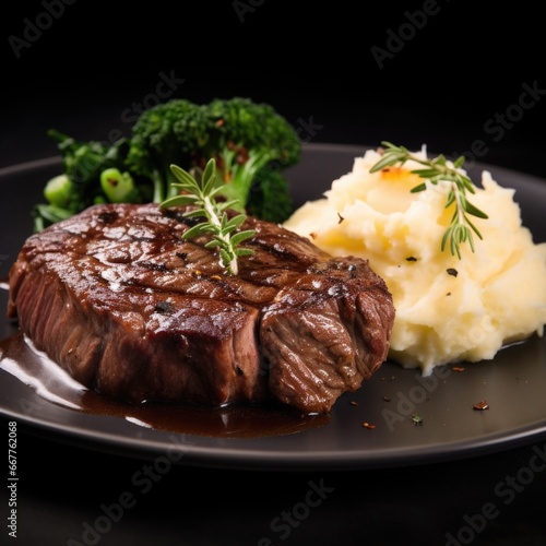 A delicious meal consisting of a juicy steak and creamy mashed potatoes. Perfect for a hearty dinner or a restaurant menu