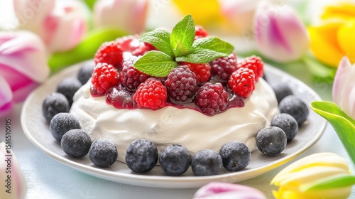 A delicious pavlova topped with berries and mint on a decorative plate.