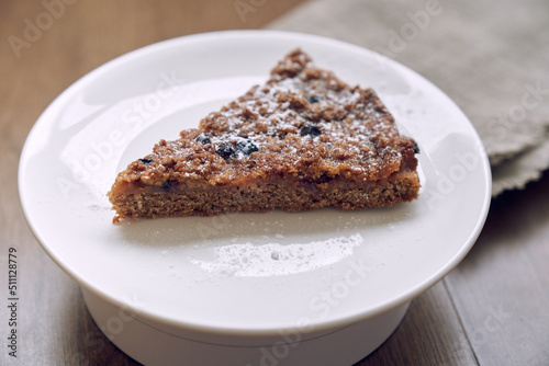 A delicious piece of lemongrass with blueberries and cranberries, without milk and eggs on flaxseed flour. Part of the pie is on a white plate on the table. The concept of healthy eating