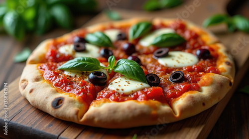 A delicious pizza sits on a wooden board, topped with rich tomato sauce, slices of mozzarella, black olives, and fresh basil leaves. Perfectly baked and inviting