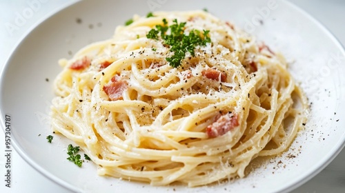 A delicious plate of spaghetti carbonara with creamy sauce and crispy pancetta, elegantly presented on a white background, highlighting the classic Italian dish.