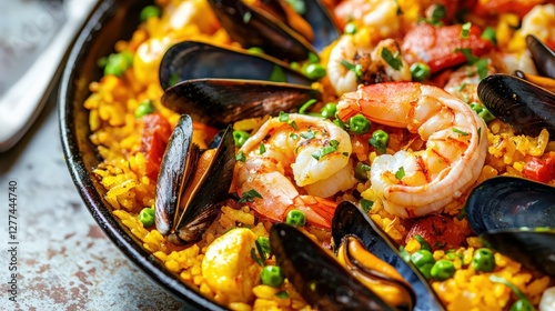 paella, seafood, shrimp, mussel, rice, saffron, spanish, dish, traditional, epicure, delicious, pan, authentic, mediterranean, flavorful, herb, lemon, parsley, rustic, vibrant, exotic, aromatic, infused, culinary, specialty, festival, elegant, savoury, presentation, indulgent, rich, homemade, seasoning, coastal, luxury, dining, fresh, gold, satisfying, appetising, cultural