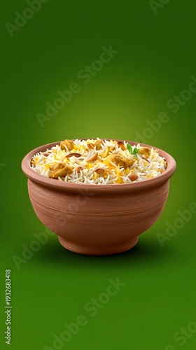 A delicious serving of chicken biryani in a traditional earthenware pot on a green background