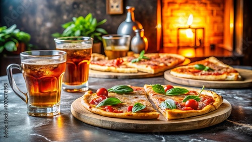 A Delicious Slice of Pizza Accompanied by Refreshing Iced Tea on a Marble Table in a Cozy, Dimly Lit Restaurant Setting Perfect for Food Lovers and Dining Experiences