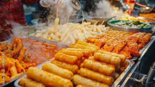 A delicious spread of Korean street food, including tteokbokki (spicy rice cakes), hotteok (sweet pancakes), and kimbap (rice rolls).