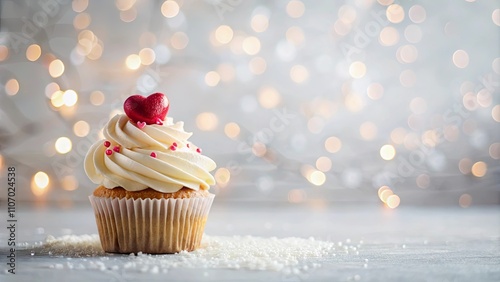 A Delicious Vanilla Cupcake Topped with a Heart-Shaped Candy, Garnished with Pink Sprinkles, Set Against a Soft, Sparkling Background