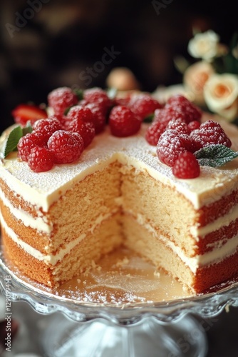 A delicious-looking cake with a slice removed, ideal for food and dessert photography