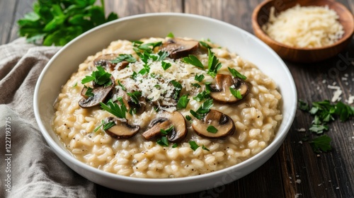 delightful, creamy, mushroom, risotto, topped, mushroom, fresh, parsley, sprinkle, parmesan, cheese, served, white, ceramic, bowl, centered, dark, wooden, table, soft, warm, lighting, highlighting, texture, small, extra, leaf