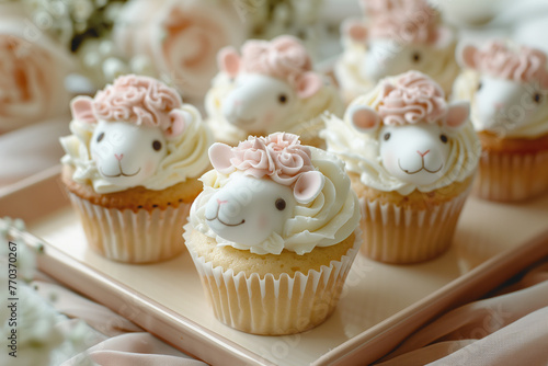cake, food, sweet, muffin, baked, cupcake, cupcake, frosting, sheep, dessert, pastry, party food, birthday party, baby shower, creative, artistic, detailed, fondant, sprinkle, cute, whimsical, playful, festive, fun, colourful, happy, celebration, springtime, easter, barnyard
