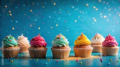 A delightful assortment of colorful cupcakes adorned with sprinkles, arranged against a vibrant blue backdrop, creating a festive and celebratory scene.