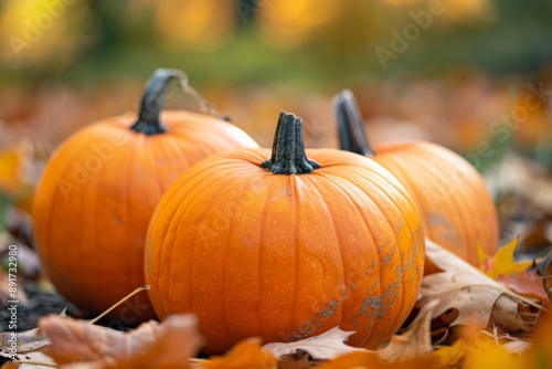 A delightful autumn scene featuring three vibrant pumpkins amidst a bed of fallen leaves, capturing the essence of the fall season with its rich colors and festive mood.