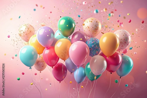 A delightful cluster of pastel balloons ascends, adorned with shimmering confetti, creating a vibrant and celebratory scene.