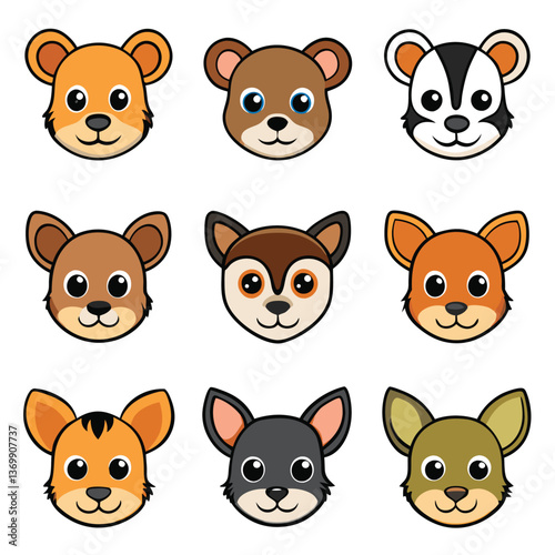 animal, cartoon, cat, dog, vector, set, icon, illustration, head, face, pet, cute, animal, pig, baby, rabbit, bear, fox, character, mammal, cow, collection, funny, panda, fun