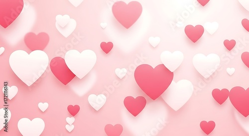A delightful design featuring a soft pink background, scattered delicate hearts in shades of pink and white, creating a romantic and lighthearted impression.