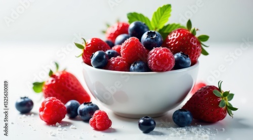 A delightful mix of fresh raspberries, strawberries, and blueberries in a pristine white bowl, complemented by a scattering of additional berries and a touch of powdered sugar on a bright surface
