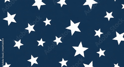 A delightful, seamless celestial pattern featuring numerous bright white stars gracefully whisked across a deep navy blue background, ideal for dreamy designs and festive occasions