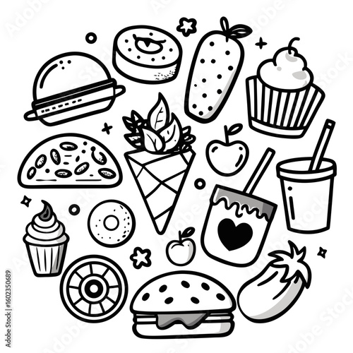 A delightful vector set of fast food and dessert icons, including burgers, coffee, cupcakes, and sandwiches, perfect for any hungry design