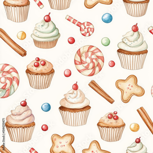A delightful watercolor pattern of Christmas gingerbread cookies, cupcakes decorated with candy, and cinnamon sticks. The seamless New Year design brings holiday warmth and sweetness, ideal for