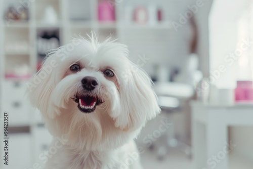 A delightful white dog with a wide grin poses in a bright, modern room, capturing a moment of pure joy.
