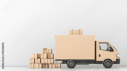 A delivery truck parked beside a stack of cardboard boxes, representing logistics and transportation in a minimalistic setting.