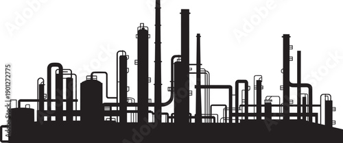 refinery, processing, production, silhouette, black, white, icon, symbol, tower, pipe, pipeline, energy, manufacturing, industry, infrastructure, plant, facility, equipment, distillation, engineering, complex, operation, fuel, crude oil, crude oil, intricate, network, power, assembly line