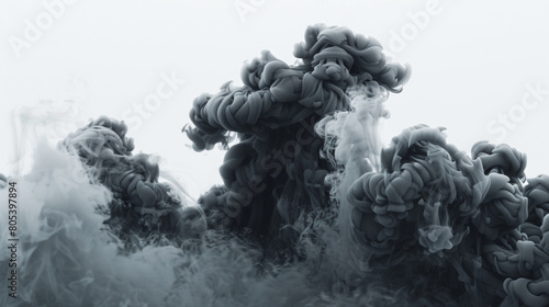 A dense plume of smoke in jet black rising against a stark white background, creating a bold and graphic abstract image.
