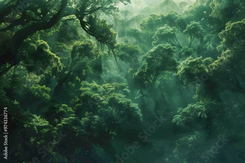 A dense rainforest teeming with life, its towering trees forming a verdant canopy overhead
