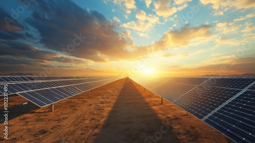 A desert solar farm with rows of panels stretching toward the horizon, with dust swirling in the dry heat.