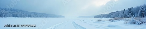 A desolate, snow-covered landscape stretches to a frozen lake under a bleak winter sky The scene evokes a sense of isolation and the harsh beauty of a cold environment , environment, tranquil