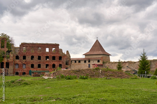 A destroyed brick building on the territory of the Oreshek fortress
