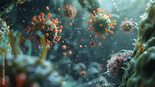 A detailed 3D model of a virus interacting with host cells, illustrating the mechanisms of virulence and infection.