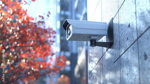 A detailed 3D white video camera mounted on a building facade, with clean lines and high-definition lighting