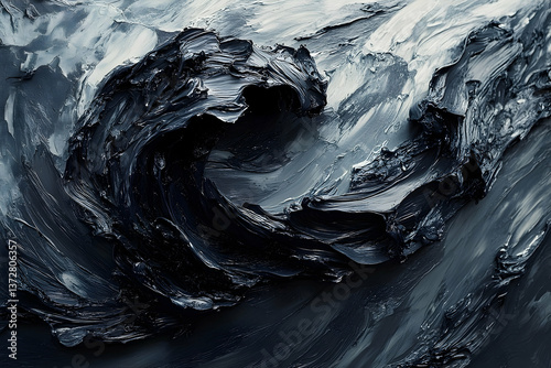 texture, art, abstract, wave, ocean, movement, black, grey, white, paint, brushstroke, surface, energy, flow, dynamic, fluid, coarse, rough, dark, light, contrast, swirling, dramatic, expressive, thick, layered, opaque, monochrome, shadow, highlight, brush, vibrant, visual, depth, formation, pattern, composition, detail, artistic, modern, element, shape, structure, form, material, creative, design, style