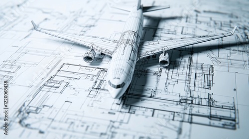 A detailed aircraft model placed on engineering blueprints, symbolizing design and innovation.