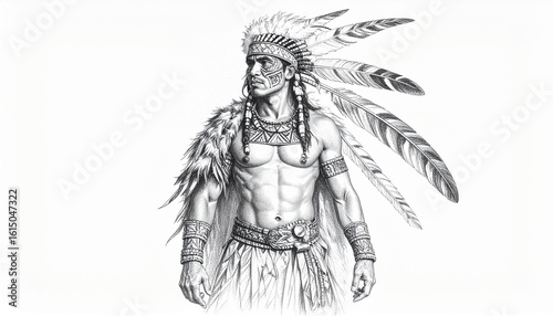 native, american, indigenous, chief, warrior, leader, headdress, feather, portrait, face, skin, eye, expression, strong, muscular, body, chest, arm, hand, wrist, jewellery, necklace, bead, clothing, skirt, fur, cloak, shoulder, hair, braid, detailed, drawing, art, illustration, crayons, vignetting, graphic, monochrome, black, white, culture, heritage, history, tradition, tribal, nation, proud, confident, gaze